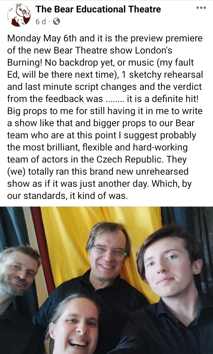Již podruhé v tomto školním roce jsme u nás ve škole přivítali divadelní společnost The Bear Educational Theatre. V pondělí 6. května měli žáci možnost zhlédnout předpremiéru nově upravené hry London‘s Burning, která přibližuje okolnosti devastujícího požáru v Londýně v roce 1666. Herci využili celý prostor naší auly k tomu, aby během představení komunikovali s žáky. Zařazené interaktivní aktivity ocenili především žáci nižšího gymnázia. Společnosti děkujeme a těšíme se na jejich další hry.