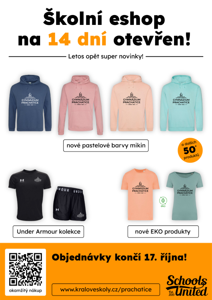 Opět jsme si jako škola nechali vytvořit vlastní volnočasovou školní kolekci oblečení, jejíž náhled vidíte níže a kterou je možné si aktuálně pořídit na našem e-shopu www.kraloveskoly.cz/prachatice.