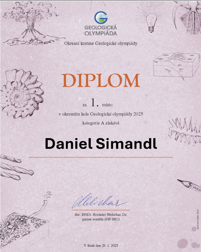 Na naší škole proběhlo školní a okresní kolo geologické olympiády. Pořádá ho každoročně online Masarykova univerzita v Brně. V mladší kategorii okresního kola se na prvním místě umístil Daniel Simandl z 2.A a postupuje do krajského kola. Druhé místo obsadil Joel Veselý ze 3. A a třetí místo Vojtěch Vinš ze 3.A. V kategorii starších žáků zvítězila Ema Danielová a druhé místo obhájila Tereza Jelínková, obě děvčata jsou ze sexty. Také Ema postupuje do krajského kola, které se bude konat prezenčně v Jihočeském muzeu. Všem účastníkům gratulujeme a radujeme se, že u nich radost z přírodovědného bádání rozhodně neutuchá!
