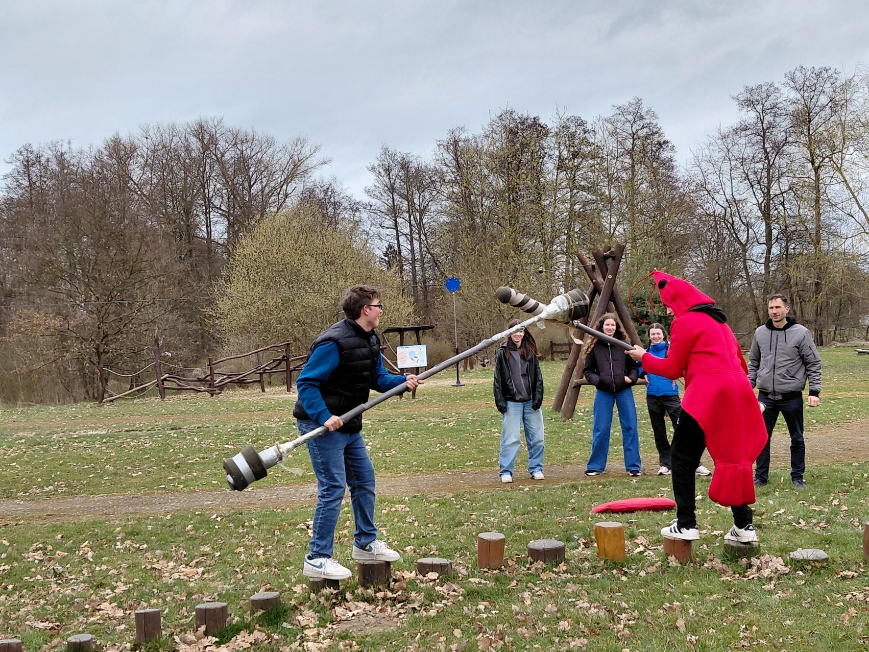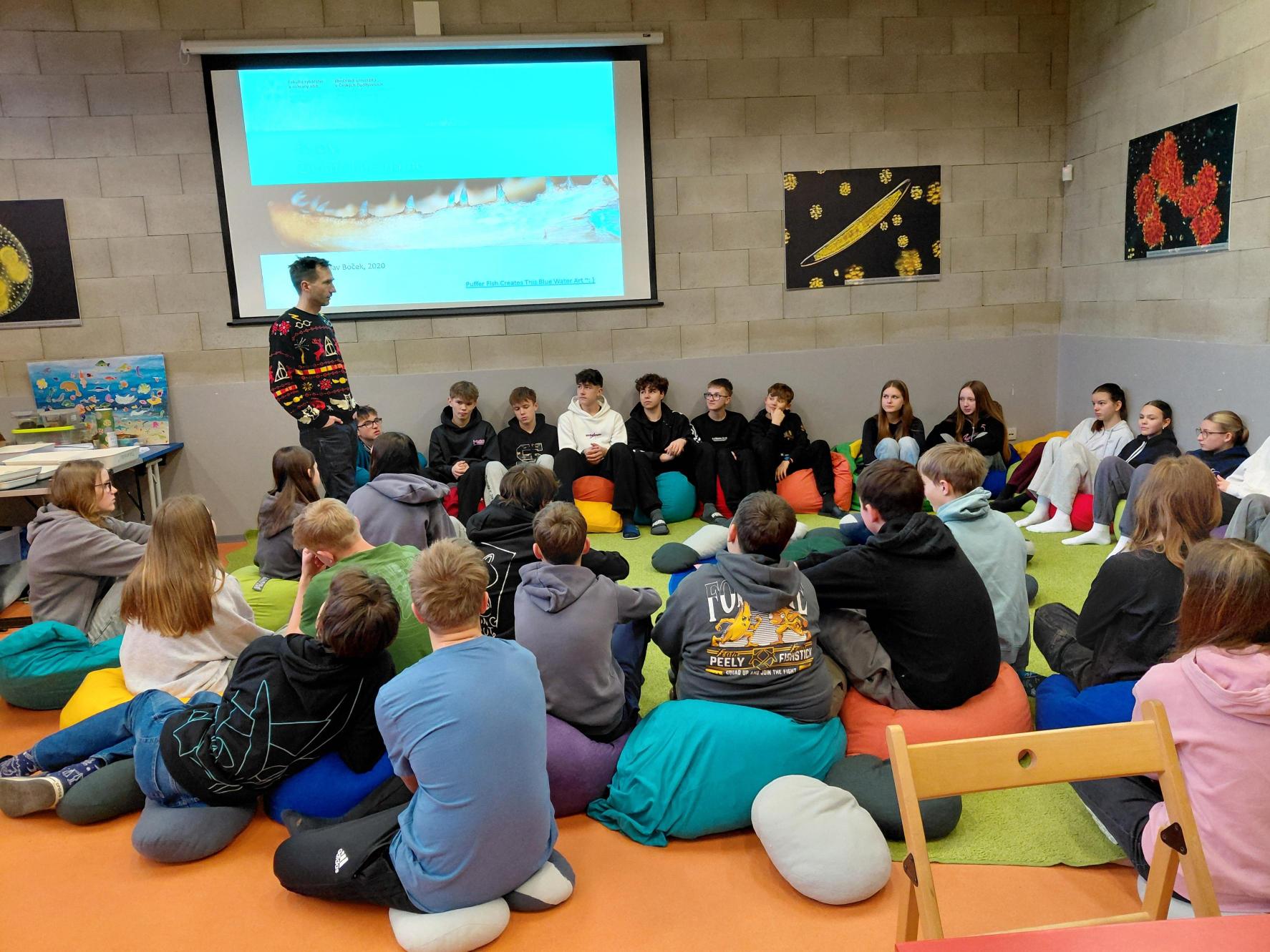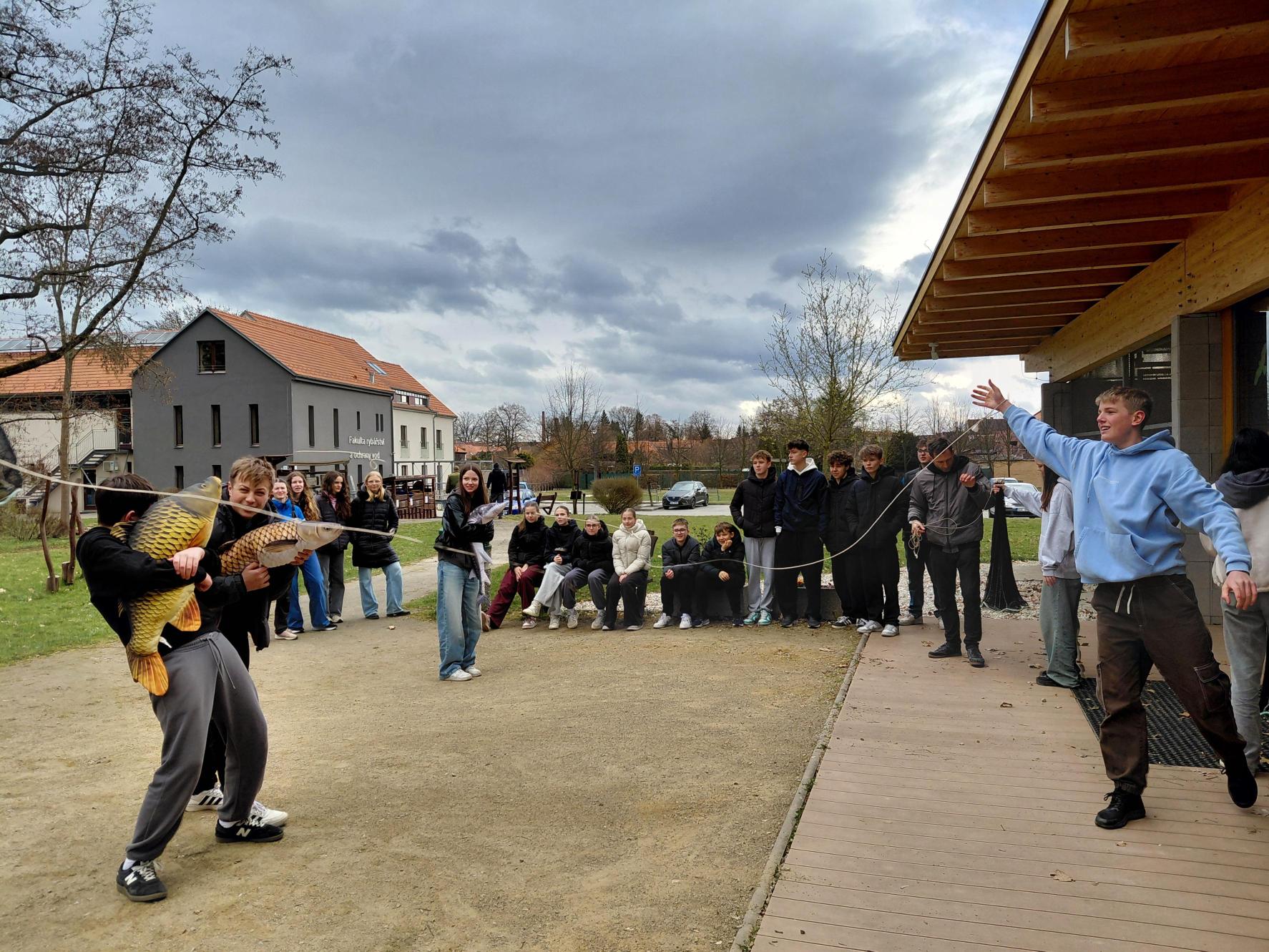 Po příjezdu do Vodňan jsme vyrazili na krátkou cestu do výukového centra MEVPIS Vodňany, kde jsme první den hráli různé naučné hry – například házení rybářské sítě po spolužácích, kteří představovali ryby. Také jsme si povídali o invazních druzích. Tím je například rak signální, který přenáší račí mor na naše raky říční, kteří jsou kvůli tomu ohroženým druhem.