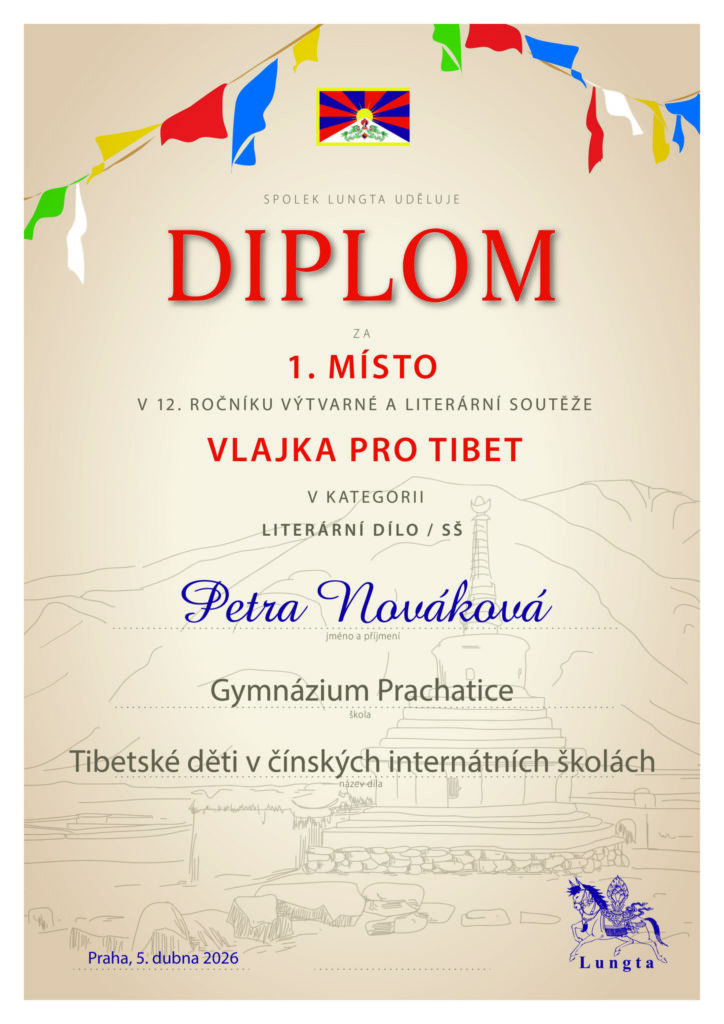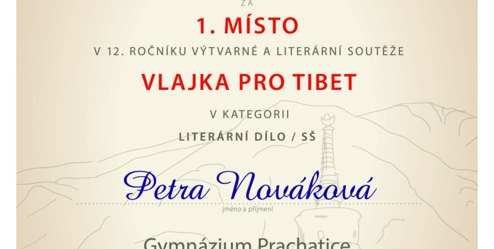 Naše škola se také letos zapojila do 12. ročníku literární soutěže Vlajka pro Tibet. Studentka Petra Nováková (6.A) zvítězila v kategorii SŠ se svou prací „Tibetské děti v čínských internátních školách“. Děkujeme za reprezentaci školy a blahopřejeme k tak velkému úspěchu.