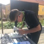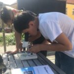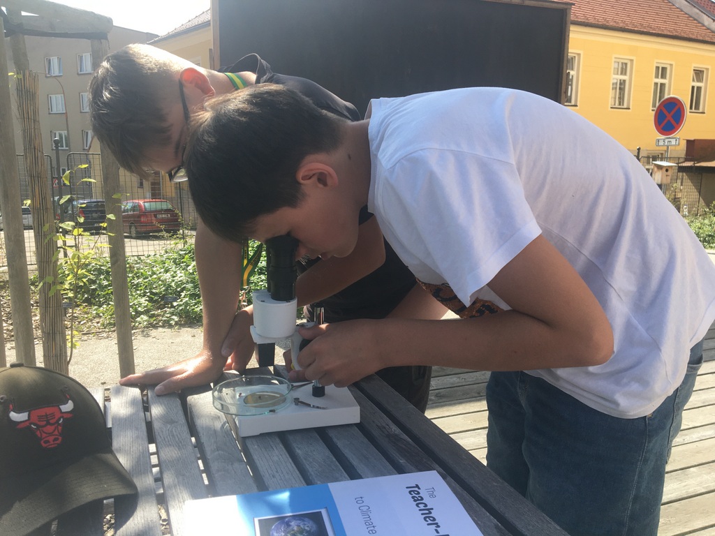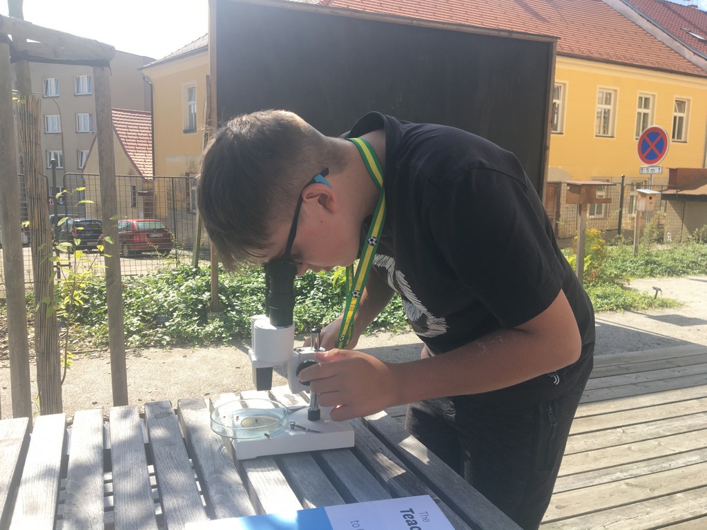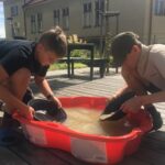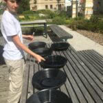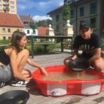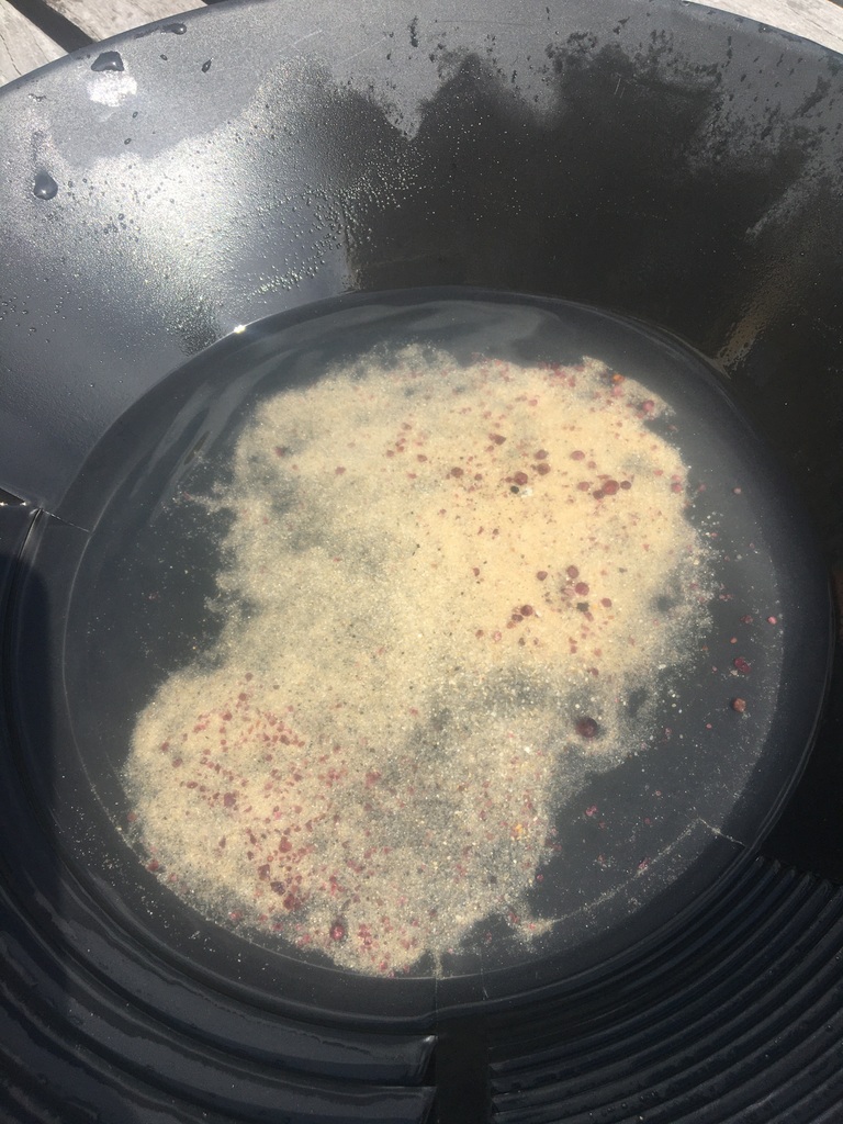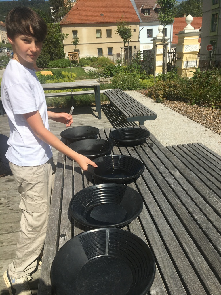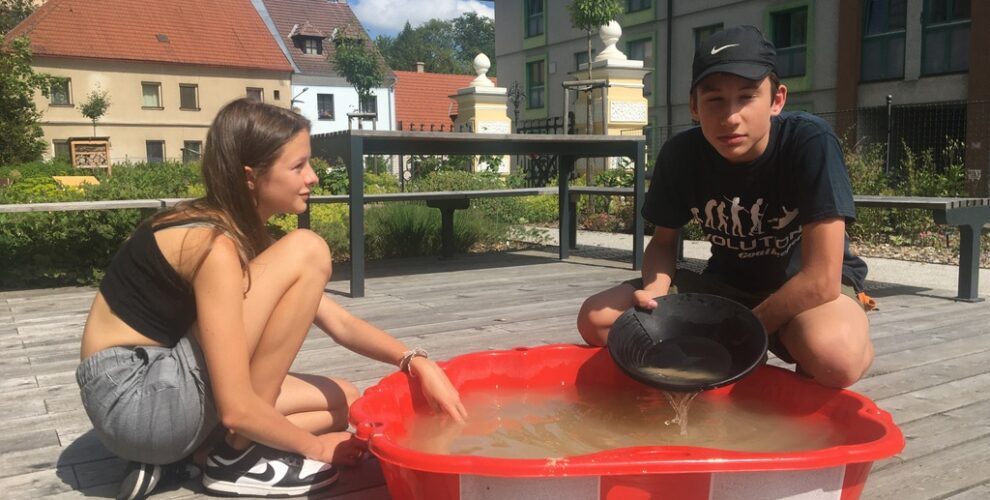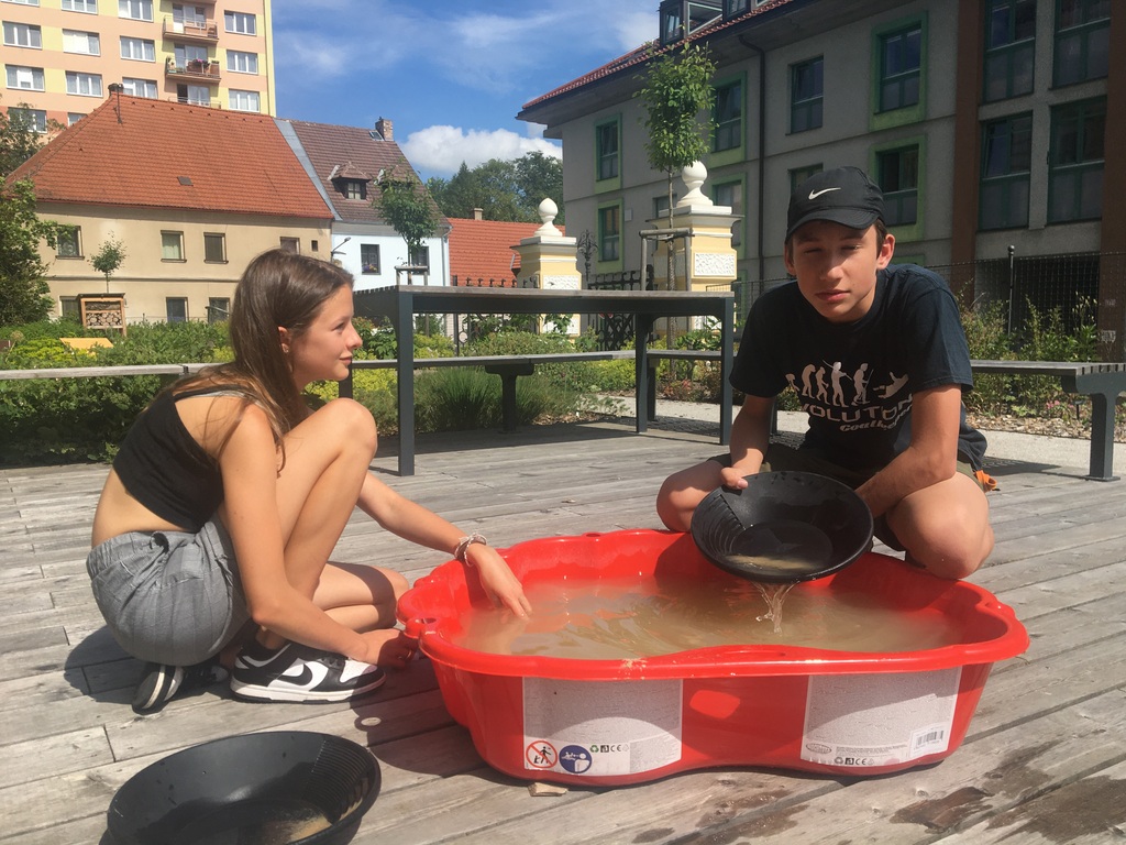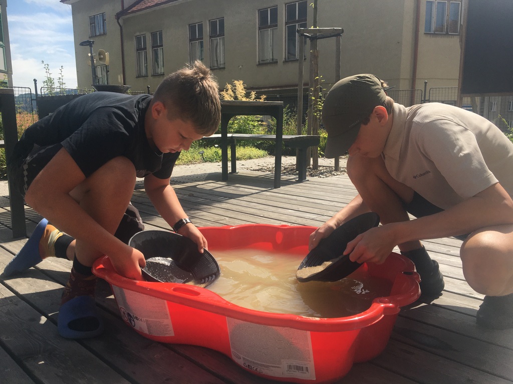 Ve venkovní učebně gymnázia se v tomto týdnu střídají žáci u vodou napuštěných bazénků. Nejde ale primárně o příjemné ochlazení! Na dně je písek, který obsahuje vzácné granáty. Učíme se zde pomocí rýžovacích pánví separovat těžké minerály a rudy (včetně malých zlatinek). Techniku rýžování je možné si osvojit například během velké přestávky a pak už ji jen zdokonalovat a plnit si zkumavku krásnými červenými drahokamy!