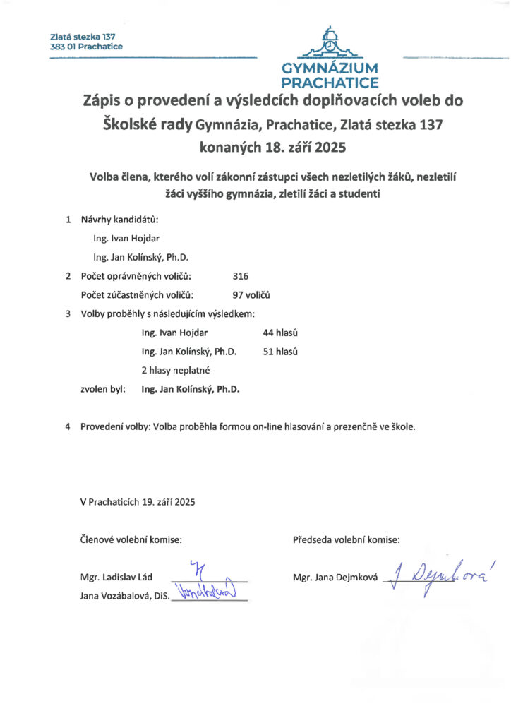 Zápis o provedení a výsledcích doplňovacích voleb do Školské rady Gymnázia, Prachatice, Zlatá stezka 137